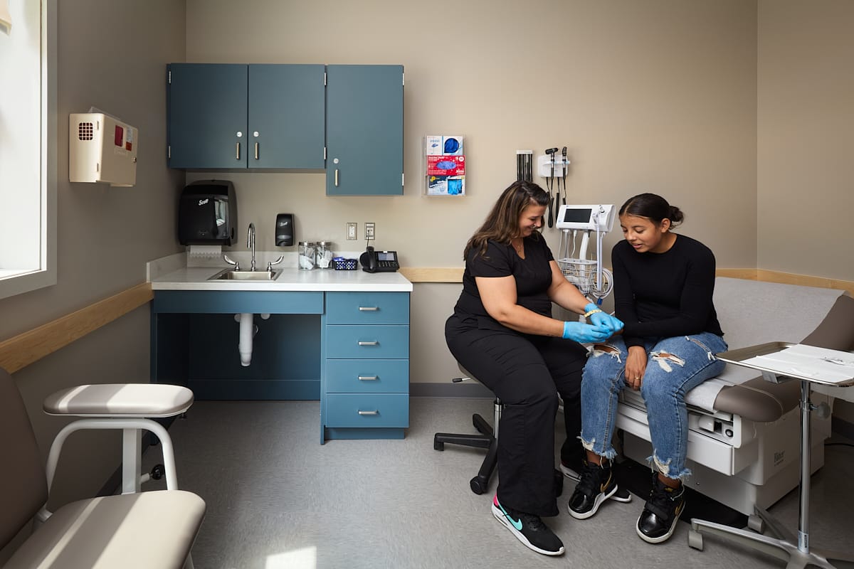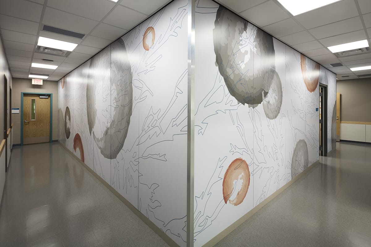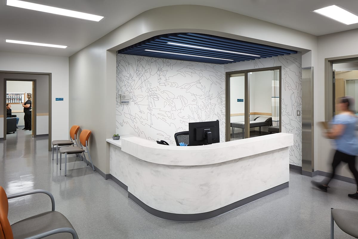 Renovation of a 2,300 SF area within an existing middle school. Scope of work included temporarily relocating the school nurse’s office and expanding the school’s health program by converting two classrooms into a health clinic operated by HealthPoint. This expansion included four new exam rooms, nurse’s office and cot room, two new restrooms, a lab and an office. The reception area and entire corridor features custom graphic wall panels. The reception area also features baffle ceilings, custom stone reception desk and dimensional lettering. We were able to save the owner $12,000 by lowering the wall heights that were not adding value.